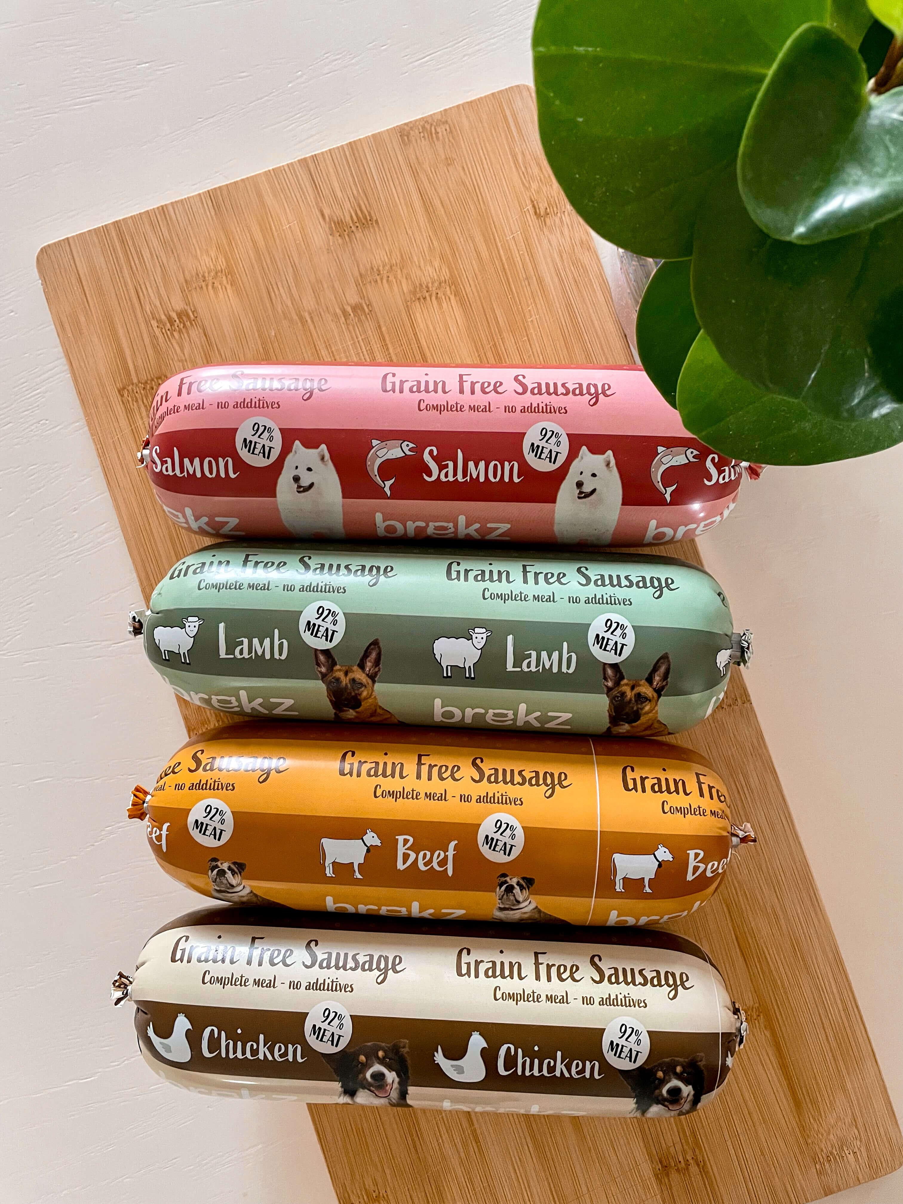 Brekz getreidefreie Wurst für den Hund (600 Gramm) gibt es in vier leckeren Geschmacksrichtungen: Huhn, Rind, Lamm und Lachs.