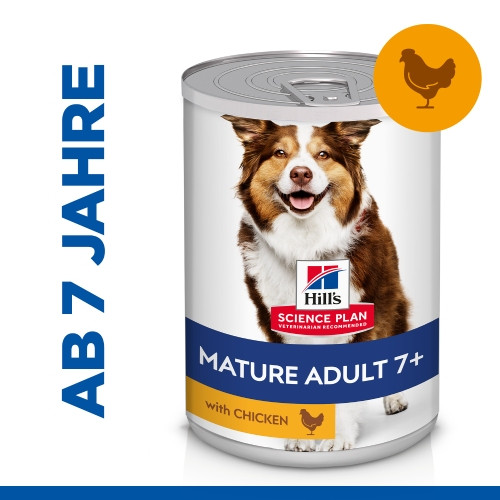 Hill's Mature Adult 7+ mit Huhn Hunde-Nassfutter (370gr Dosen) ist ein weiches Nassfutter mit glatter Struktur, das für Hunde ab 7 Jahren geeignet ist.