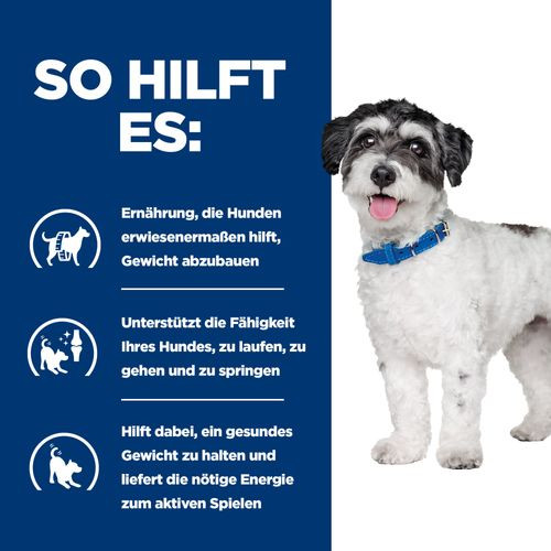 Hill's Prescription Diet J/D Weight Metabolic + Mobility Mini Huhn ist ein diätetisches Komplettfutter zur Reduzierung des Körpergewichts erwachsener kleiner Hunde.