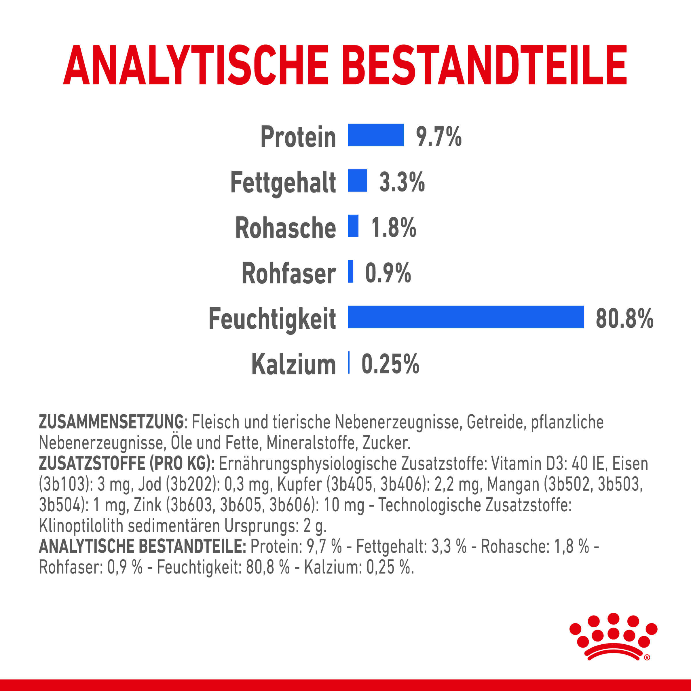 Rohprotein (9,7%), Rohfett (3,3%), Rohfaser (0,9%), Rohasche (1,8%), Feuchtigkeit (80,8%), Kalzium (0,25%).