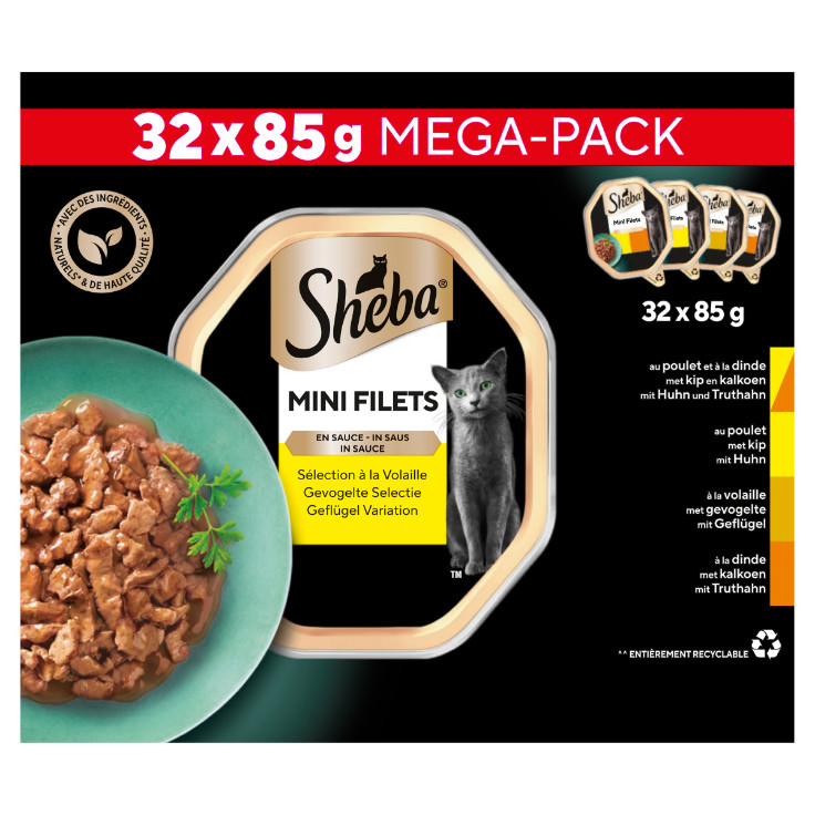 Sheba Mini Filets mit Geflügel in Sauce Megapack Nassfutter Katze ist ein Katzenfutter, das jeder Katze schmeckt. In praktischen 85-Gramm-Becher können Sie Ihrer Katze im Handumdrehen eine nahrhafte Mahlzeit servieren. Variieren Sie mit den köstlichen Geschmacksrichtungen dieser Vorteilsbox.