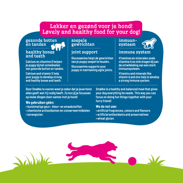 Smølke Puppy Maxi Welpenfutter trägt in erster Linie zur Entwicklung gesunder Knochen und Zähne bei. Mit Beta-Glucanen aus Hefe und Vitaminen stimuliert Smølke Puppy Maxi auch das Immunsystem. Neben der Gesundheit wurde natürlich auch viel Wert auf den Geschmack gelegt. Mit Huhn als Hauptzutat, ergänzt unter anderem mit Lamm, servieren Sie Ihrem Welpen eine schmackhafte Mahlzeit.