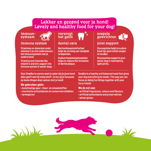 Smølke Senior Mini Hundefutter ist ein vollwertiges Kompletfutter mit natürlichen Zutaten, das Ihrem alternden Hund einer kleineren Rasse hilft, bis ins hohe Alter fit zu bleiben. Ab 8 Jahren wird empfohlen, Ihrem Vierbeiner eine Ernährung für Senioren zu geben. Das Immunsystem braucht mehr Unterstützung. Deshalb enthält Smølke Senior zusätzliche Vitamine und spezielle Nährstoffe wie L-Carnitin, um das Gewicht Ihres Hundes zu halten und das Immunsystem zu unterstützen. Ältere Hunde haben ein erhöhtes Risiko für Zahnprobleme. Die speziellen Mineralstoffe in diesem Lebensmittel unterstützen den Erhalt gesunder und kräftiger Zähne. Smølke Senior ist weizenfrei und hat ein einzigartiges Proteinprofil aus niederländischem Huhn, britischem Lamm und MSC-zertifiziertem Fisch. Diese einzigartige Kombination aus regionalen und nachhaltigen Zutaten stellt sicher, dass Ihr Haustier alle wichtigen Nährstoffe erhält, die auf die spezifischen Bedürfnisse Ihres älteren Hundes abgestimmt sind. Geeignet für kleine Hunde bis 10 kg.