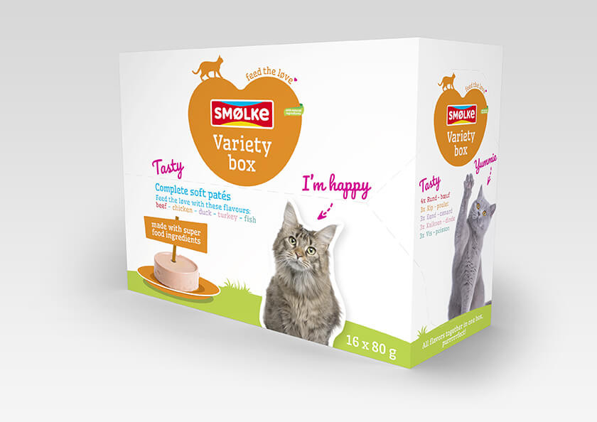 Smølke Soft Paté Variety Box Kombipackung Katzenfutter (16 x 80 gr) ist ein Kombinationspaket aus 5 weichen Pasteten, die zusammen in einer Schachtel verpackt sind. So können Sie Ihrer Katze ganz einfach jeden Tag eine andere Mahlzeit servieren.