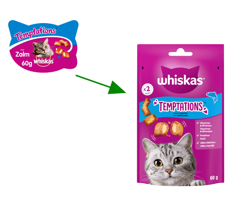 Whiskas Temptations mit Lachsgeschmack Katzensnacks sind köstliche und unwiderstehliche Leckerbissen für Ihre geliebte Katze – als Belohnung oder zum Verwöhnen.