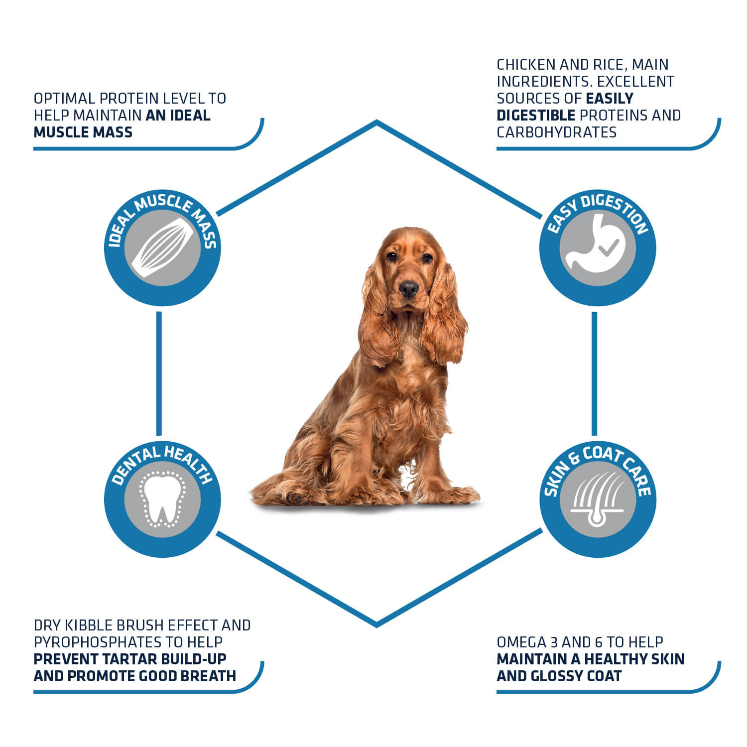 Advance Medium Adult au poulet et riz pour chien est un aliment complet pour les chiens de taille moyenne âgés de 1 à 7 ans.