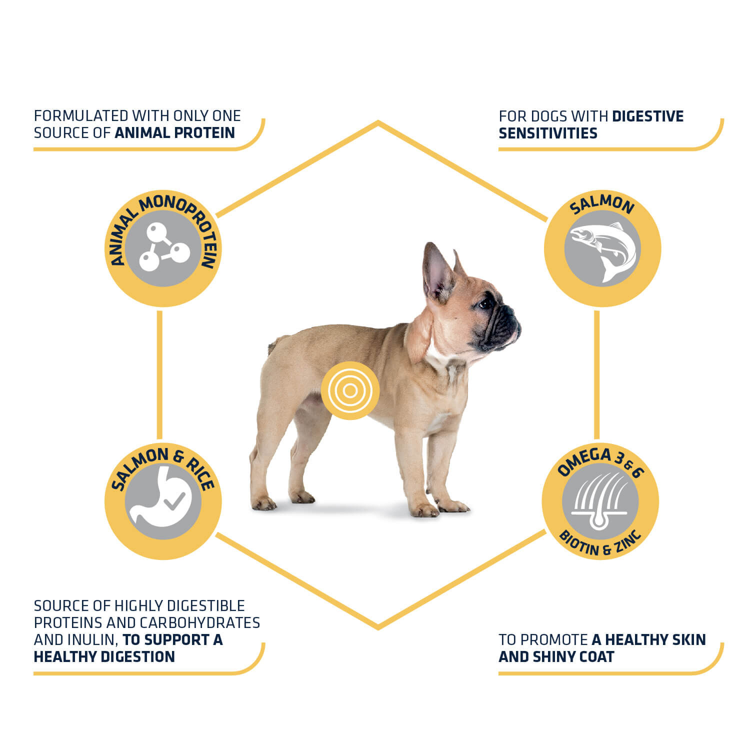 Les croquettes Advance Mini Sensitive au saumon pour chiens est un aliment complet pour les petits chiens adultes pesant moins de 10 kg et souffrant de problèmes digestifs.