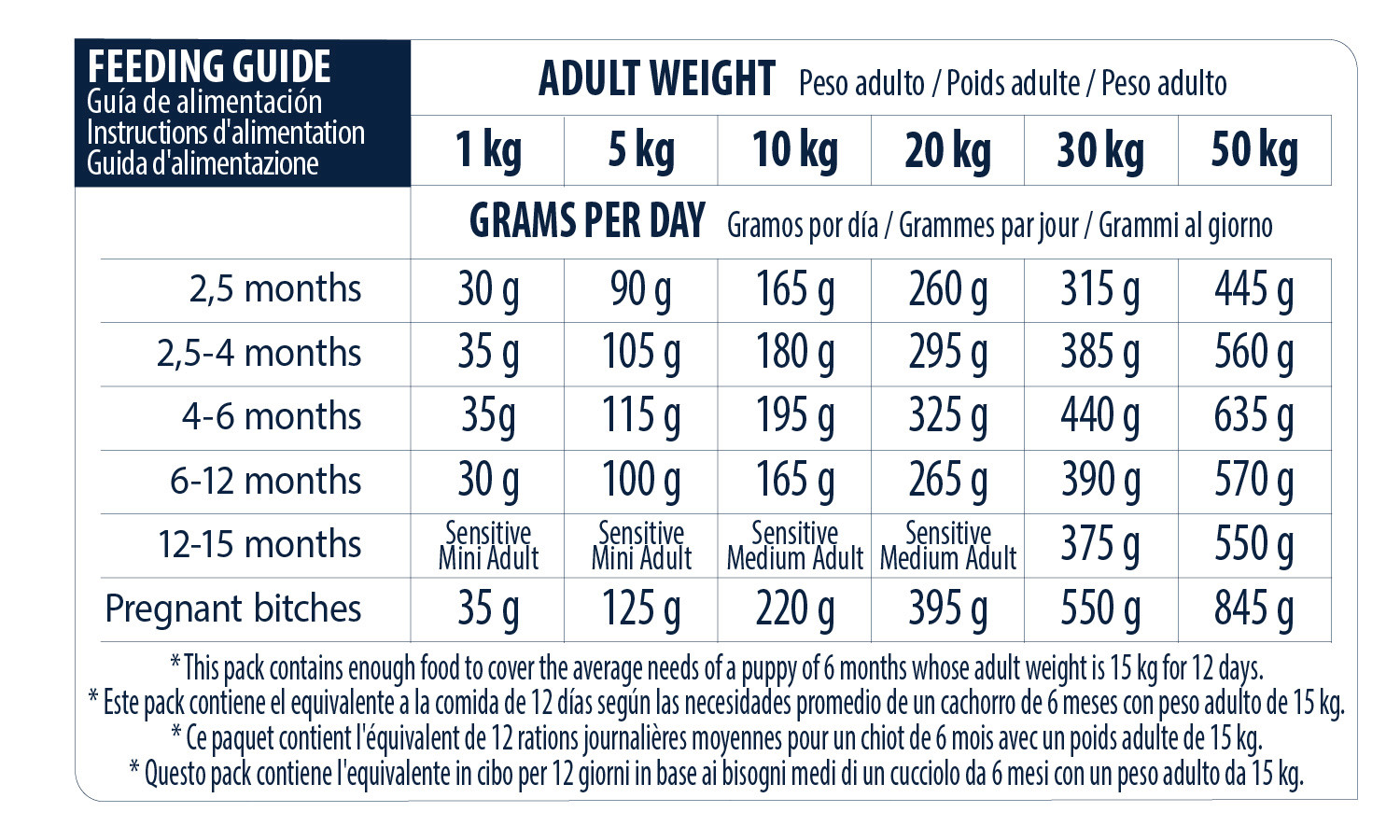 Les conseils nutritionnels figurent sur l'emballage et dans le tableau nutritionnel de cette page (sur les images ci-dessus). Il est recommandé de répartir la quantité journalière indiquée en au moins deux repas par jour. Pensez à accompagner chaque repas avec suffisamment d'eau. Les croquettes doivent être conservées dans un endroit sec et hermétique. La date de péremption est indiquée sur l'emballage. Cette durée est souvent suffisante si vous respectez les doses quotidiennes conseillées. Les conseils du tableau nutritionnel sont donnés à titre indicatif. D'autres facteurs tels que la race, le sexe, le niveau d'activité jouent également un rôle dans les besoins nutritionnels quotidiens de votre animal.