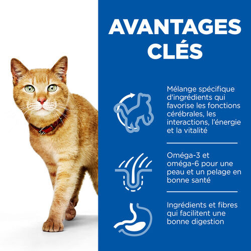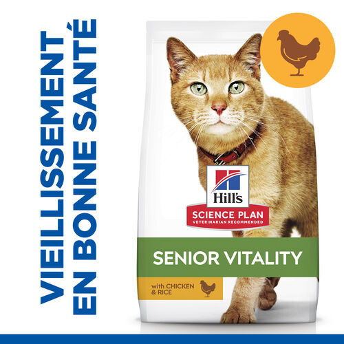 Hill's Science Plan Mature Adult Senior Vitality au poulet & au riz pour chat est un aliment équilibré spécialement développé pour, entre autres, soutenir la vitalité et les fonctions cérébrales des chats seniors.