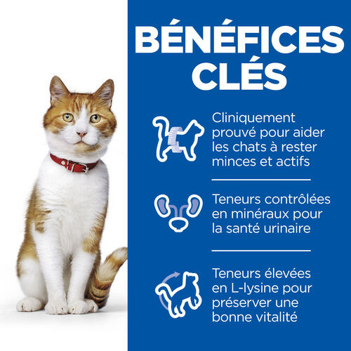 Hill's Science Plan Adult Sterilised Cat au poulet pour chat est un aliment complet pour les chats stérilisés jusqu'à 6 ans et favorise le contrôle du poids et la santé des voies urinaires.