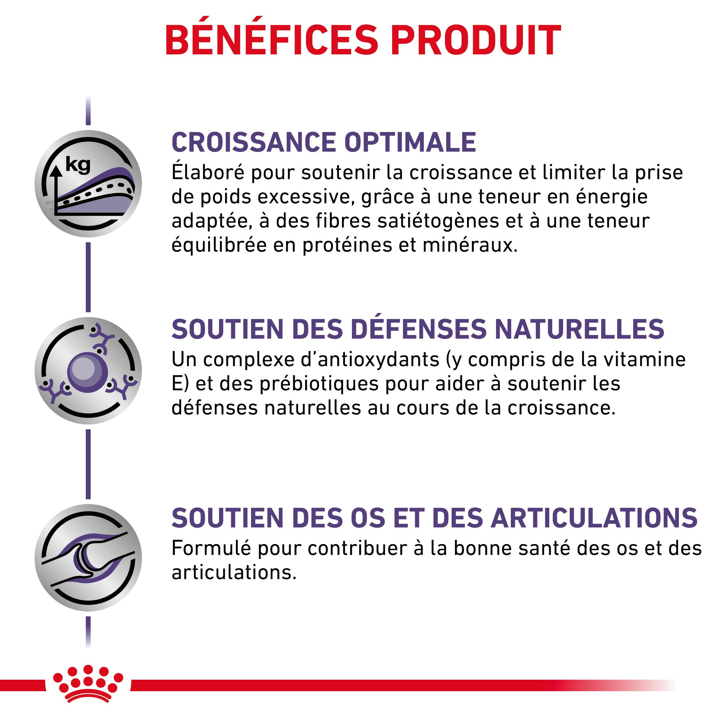 Pendant la période de croissance de votre compagnon à quatre pattes, il est important qu'il ne prenne pas trop de poids, comme ont tendance à le faire les chiens castrés ou stérilisés. Cet aliment est conçu pour répondre à ces deux besoins. Cet aliment diététique favorise une croissance optimale grâce à un apport équilibré en protéines et minéraux de haute qualité, notamment en calcium et en phosphore, pour des muscles et des os solides et en bonne santé. Parallèlement, cette formule contient une teneur modérée en graisses et en énergie pour aider votre chiot à maintenir son poids idéal. Afin de prévenir le surpoids, cet aliment contient également des fibres solubles et insolubles. Les fibres alimentaires sont importantes pour une digestion saine, elles favorisent un bon transit intestinal et maintiennent les selles molles. De plus, les fibres procurent une sensation de satiété, ce qui réduit le besoin de votre chien junior de réclamer davantage de nourriture.
