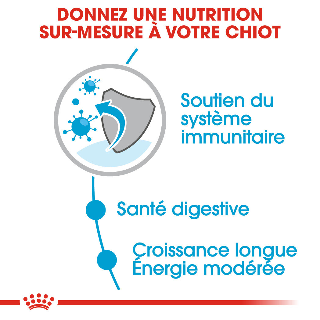 Les sachets Royal Canin Maxi Puppy pour chiots sont destinés aux chiots de grandes races (2 à 15 mois) avec un poids corporel adulte de 26 à 44 kg. La nourriture humide pour chiots Royal Canin Maxi Puppy fournit :