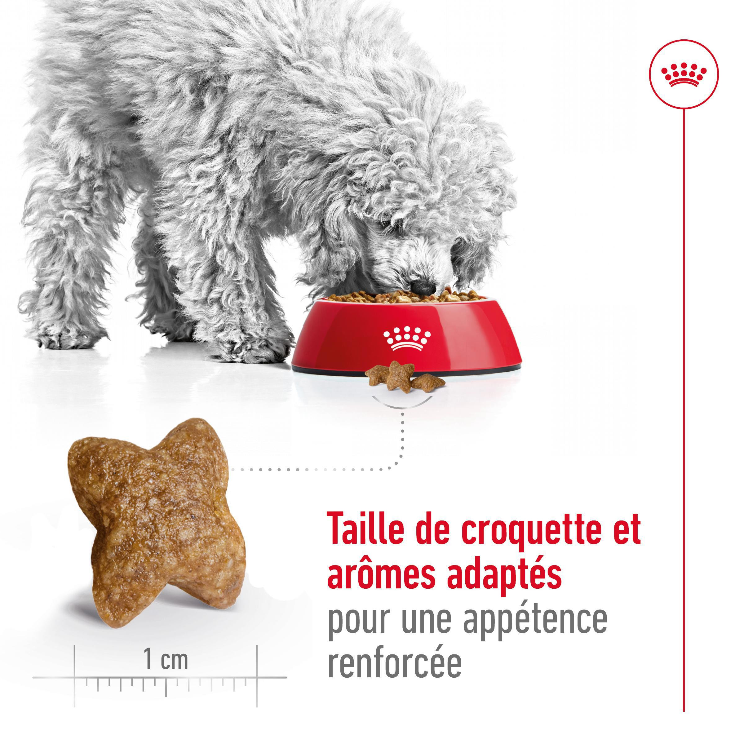 Certains petits chiens sont plus difficiles que d'autres. C'est pourquoi Royal Canin Mini Adult est particulièrement savoureux grâce à une sélection de saveurs exclusives qui plairont même aux plus difficiles. Les croquettes sont également adaptées aux petites mâchoires de votre petit chien. Ainsi, même les mangeurs difficiles obtiennent les nutriments essentiels dont ils ont besoin.