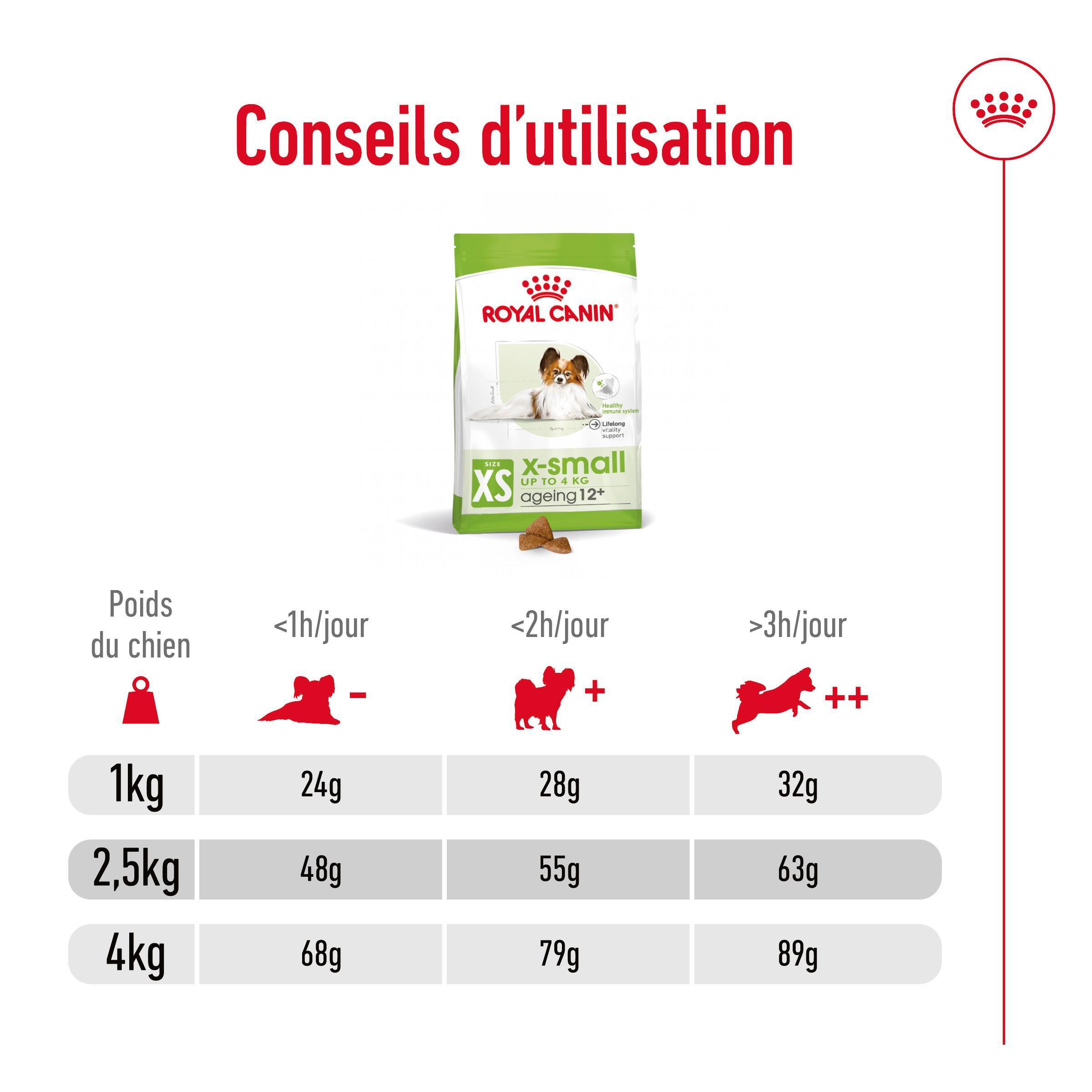 Royal Canin X-Small Ageing 12+ pour chien convient aux très petits chiens âgés de 12 ans et plus, dont le poids corporel peut atteindre 4 kg. Maintenant que votre chien a atteint un âge avancé, une alimentation complète et équilibrée est essentielle pour préserver sa santé de manière optimale. Une alimentation saine peut aider votre petit chien à rester en forme et à retarder les signes du vieillissement. À mesure que votre chien vieillit, il est encore plus important de favoriser ses fonctions corporelles saines. Royal Canin X-Small Ageing 12+ a été spécialement développé pour favoriser le vieillissement en bonne santé des chiens de petite taille. Cet aliment contient un complexe exclusif d'antioxydants qui aident à neutraliser les radicaux libres. Les acides gras oméga-3 EPA et DHA contribuent à la santé de la peau et à la brillance du pelage.