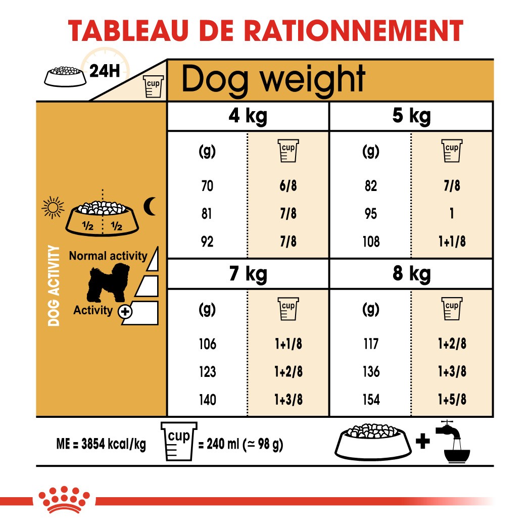 Royal Canin Bichon Frise Adult pour chien a été spécialement développé pour les caractéristiques spécifiques à la variété du bichon frisé. La nourriture peut être donnée à partir de 10 mois.