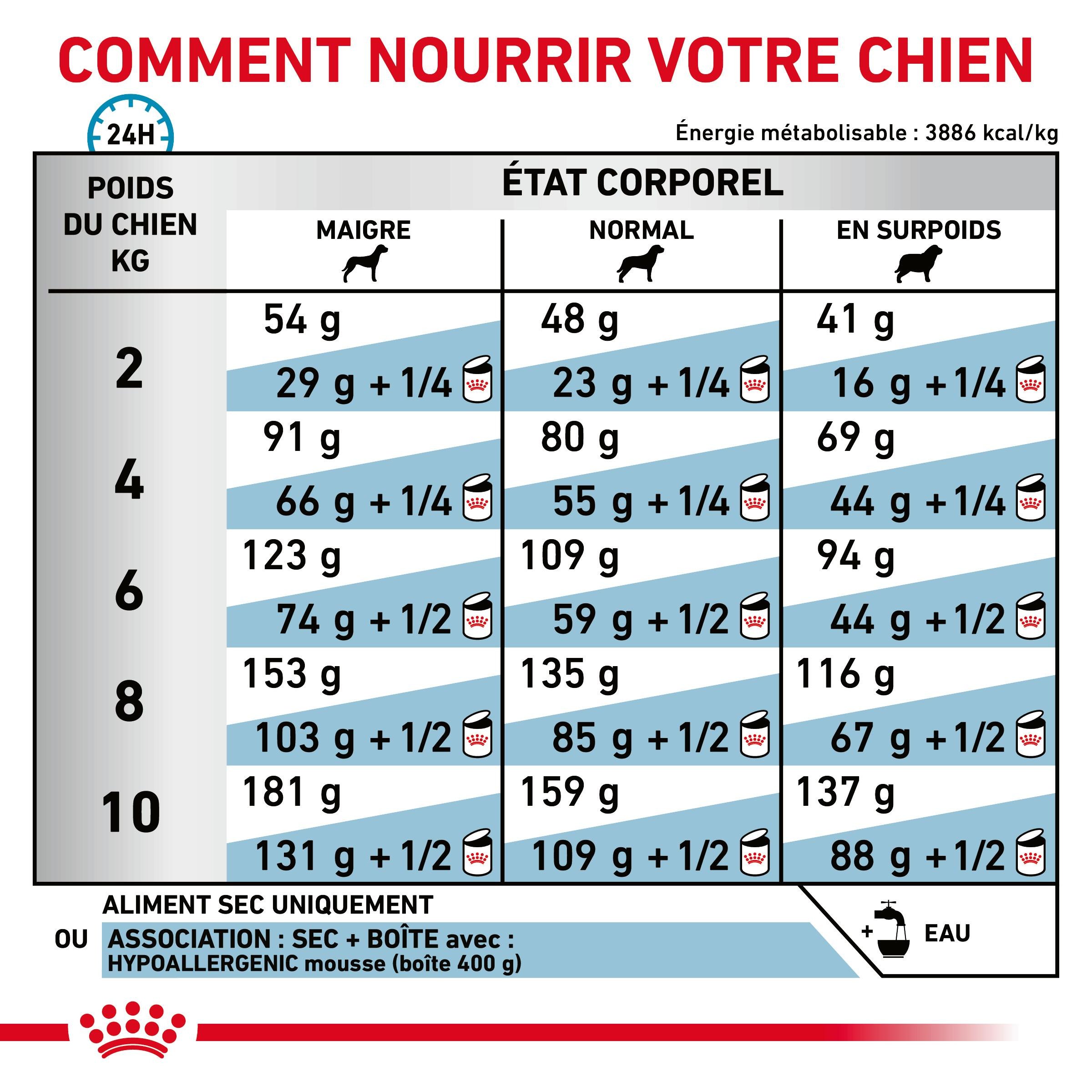Les conseils figurant dans le tableau d'alimentation sont donnés à titre indicatif ; d'autres facteurs tels que la race, le sexe, le niveau d'activité jouent également un rôle dans les besoins nutritionnels quotidiens de votre animal.