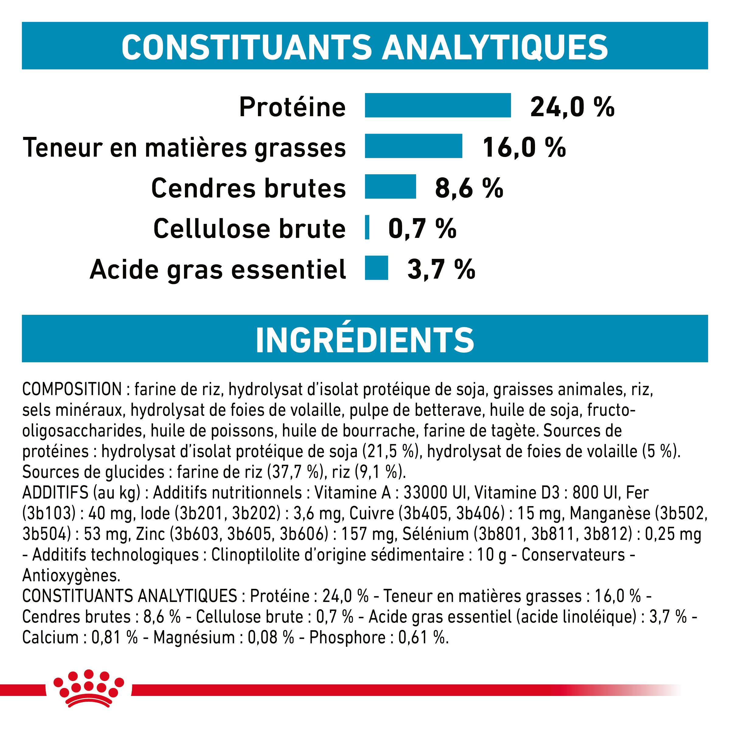 Composition : farine de riz, isolat de protéines de soja hydrolysées, graisses animales, riz, minéraux, foie de volaille hydrolysé, pulpe de betterave, huile de soja, fructo-oligosaccharides, huile de poisson, huile de bourrache, farine de tagète. Sources de protéines : isolat de protéines de soja hydrolysées (21,5 %), foie de volaille hydrolysé (5 %). Sources de glucides : farine de riz (37,7 %), riz (9,1 %).
