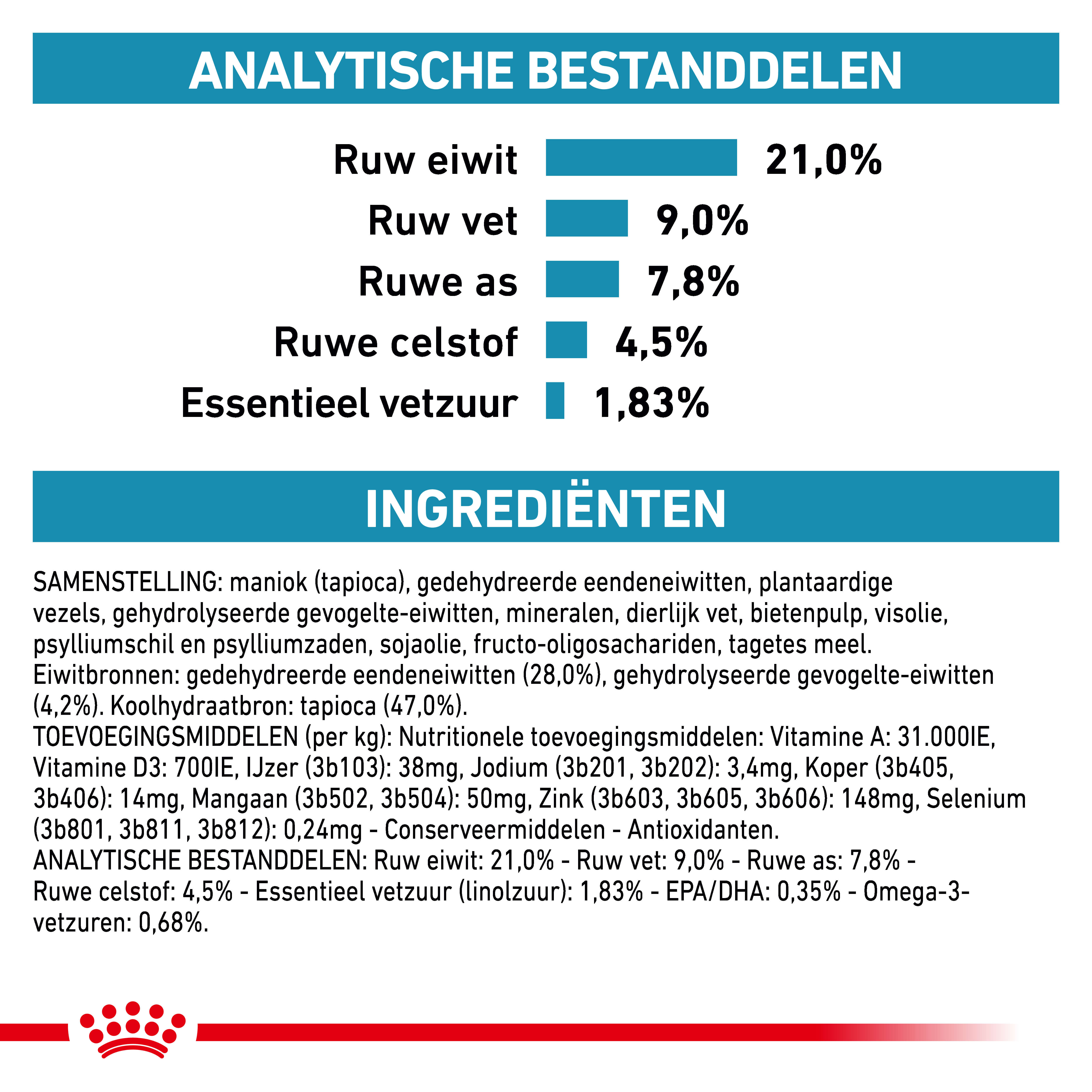Composition : manioc (tapioca), protéines de canard déshydratées, fibres végétales, protéines de volaille hydrolysées, minéraux, graisse animale, pulpe de betterave, huile de poisson, enveloppe de psyllium et graines de psyllium, huile de soja, fructo-oligosaccharides, farine de tagète. Sources de protéines : protéines de canard déshydratées (28,0 %), protéines de volaille hydrolysées (4,2 %). Source de glucides : tapioca (47,0 %).
