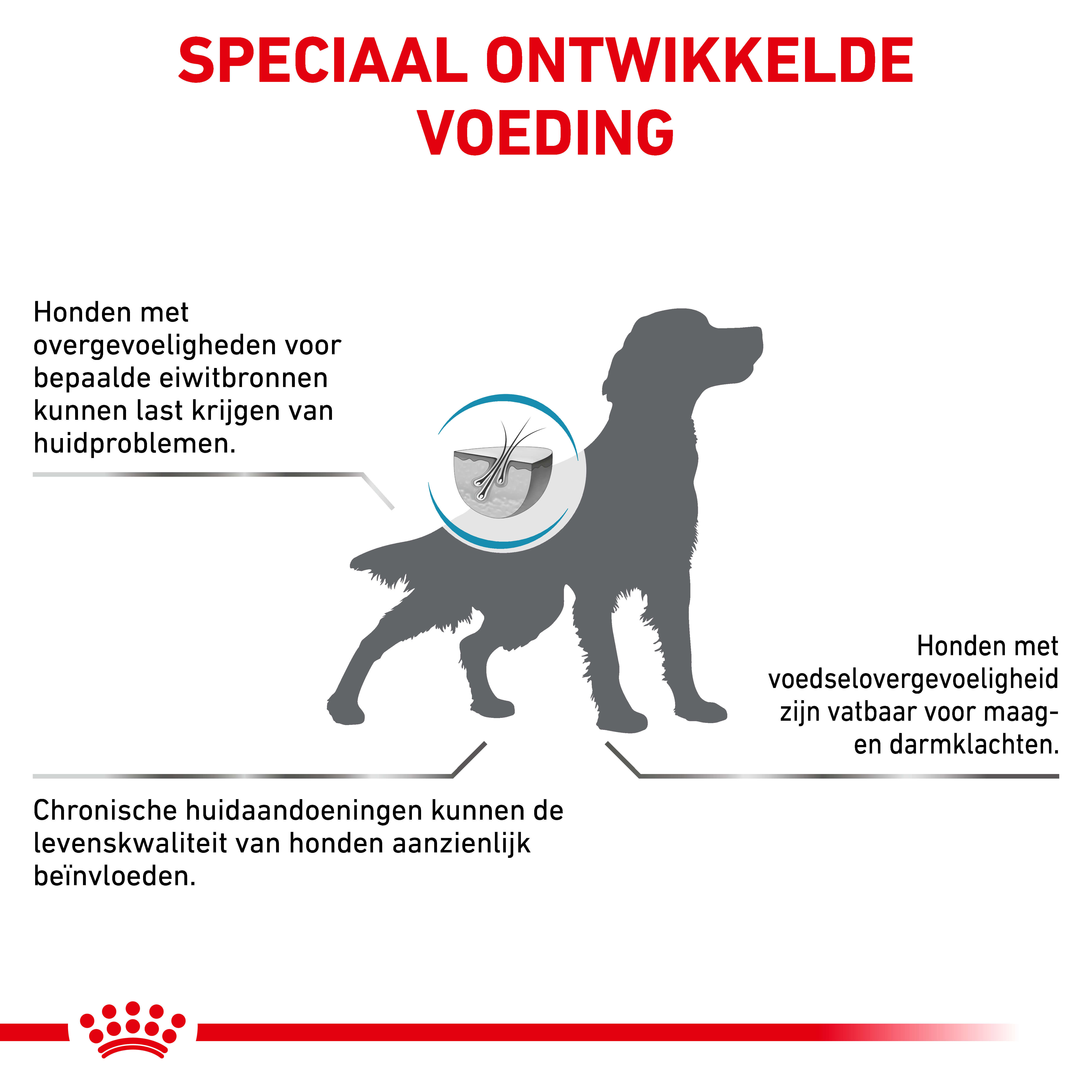 Votre chien souffre d'hypersensibilité alimentaire ? Cet aliment vétérinaire contient un nombre limité de sources de protéines (canard et volaille) afin de réduire le risque de réactions allergiques. Les symptômes d'intolérance alimentaire se manifestent souvent par des problèmes cutanés ou digestifs. Ces croquettes aident à soulager ces symptômes. Sa composition spéciale renforce la barrière protectrice naturelle de la peau. L'ajout d'acides gras oméga-3 et d'autres nutriments favorise une peau saine et une digestion équilibrée. Enfin, cet aliment diététique aide à maintenir la santé des voies urinaires de votre chien.