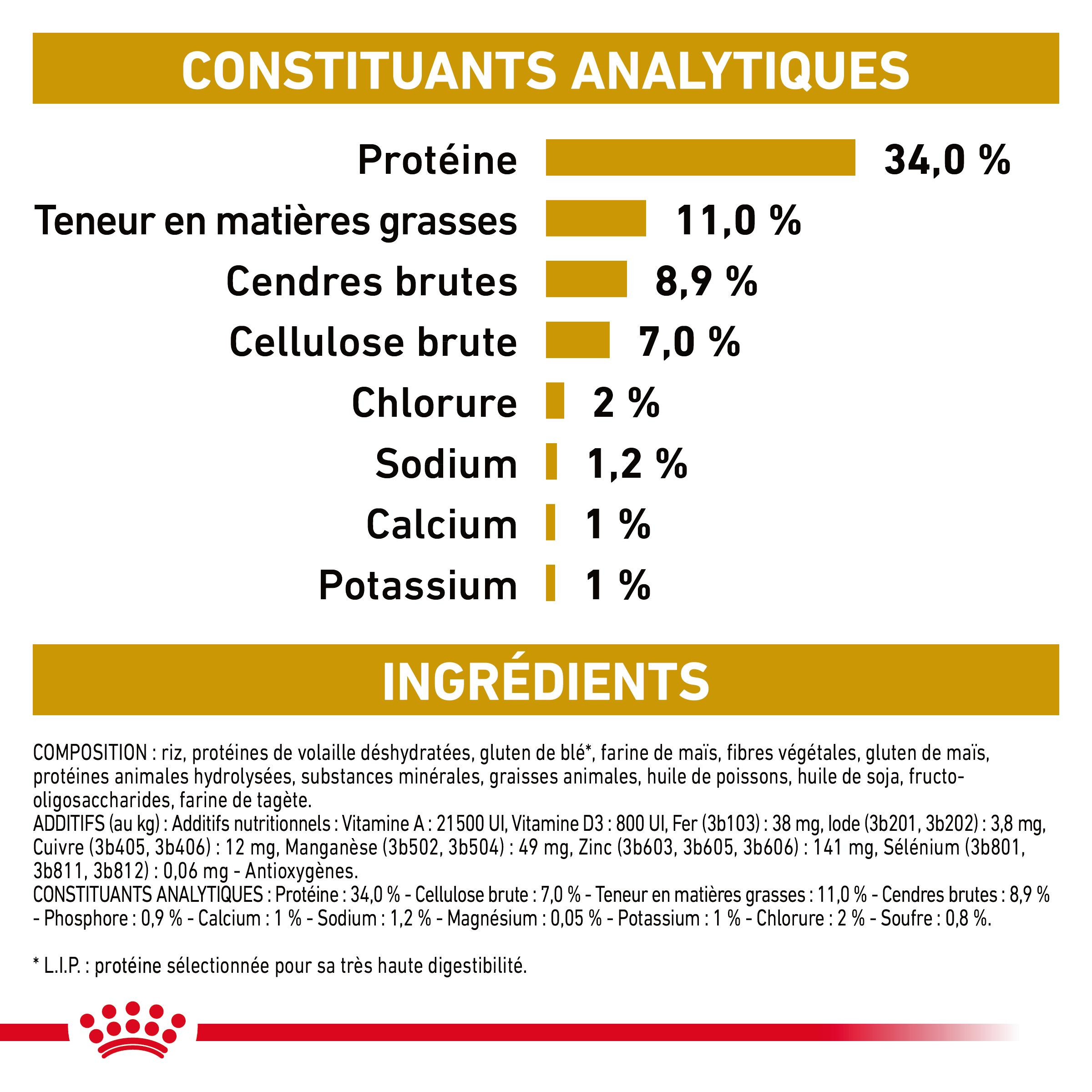 Protéines brutes (34 %), graisses brutes (11 %), fibres brutes (7 %), cendres brutes (9,1 %), calcium (1 %), phosphore (0,95 %), magnésium (0,05 %), acide arachidonique (0,06 %), vitamine B8 (4,26 mg), chlorure (1,89), choline (2).000 mg), fer (167 mg), humidité (5,5 %), vitamine B9 (18,4 mg), glucosamine (1785 mg), iode (3,2 mg), potassium (1 %), cuivre (15 mg), l-carntine (200 mg), acide linoléique (2,45 %), manganèse (68 mg), sodium (1,1 %), vitamine B3 (107,3 mg), acides gras oméga-3 (0,52 %), acides gras oméga-6 (2,59 %), vitamine B5 (49,2 mg), sélénium (0,15 mg), amidon (27,3 %), taurine (2).100 mg), zinc (219 mg), vitamine A (24 000 UI), vitamine B (9,4 mg), vitamine B12 (0,1 mg), vitamine B2 (33,9 mg), vitamine B6 (51,3 mg), vitamine C (50 mg), vitamine D3 (500 UI), vitamine E (500 mg), énergie métabolisable (3.520 kcal), lésions alimentaires (13,1%) EPA + acides gras DHA (0,26 mg), lutéine (5 mg), araginine (1,64%), l-lysine (1,06%), dl-méthionine (1,05), méthionine/cystine (1,62) et extraits sans azote (33,4 mg).