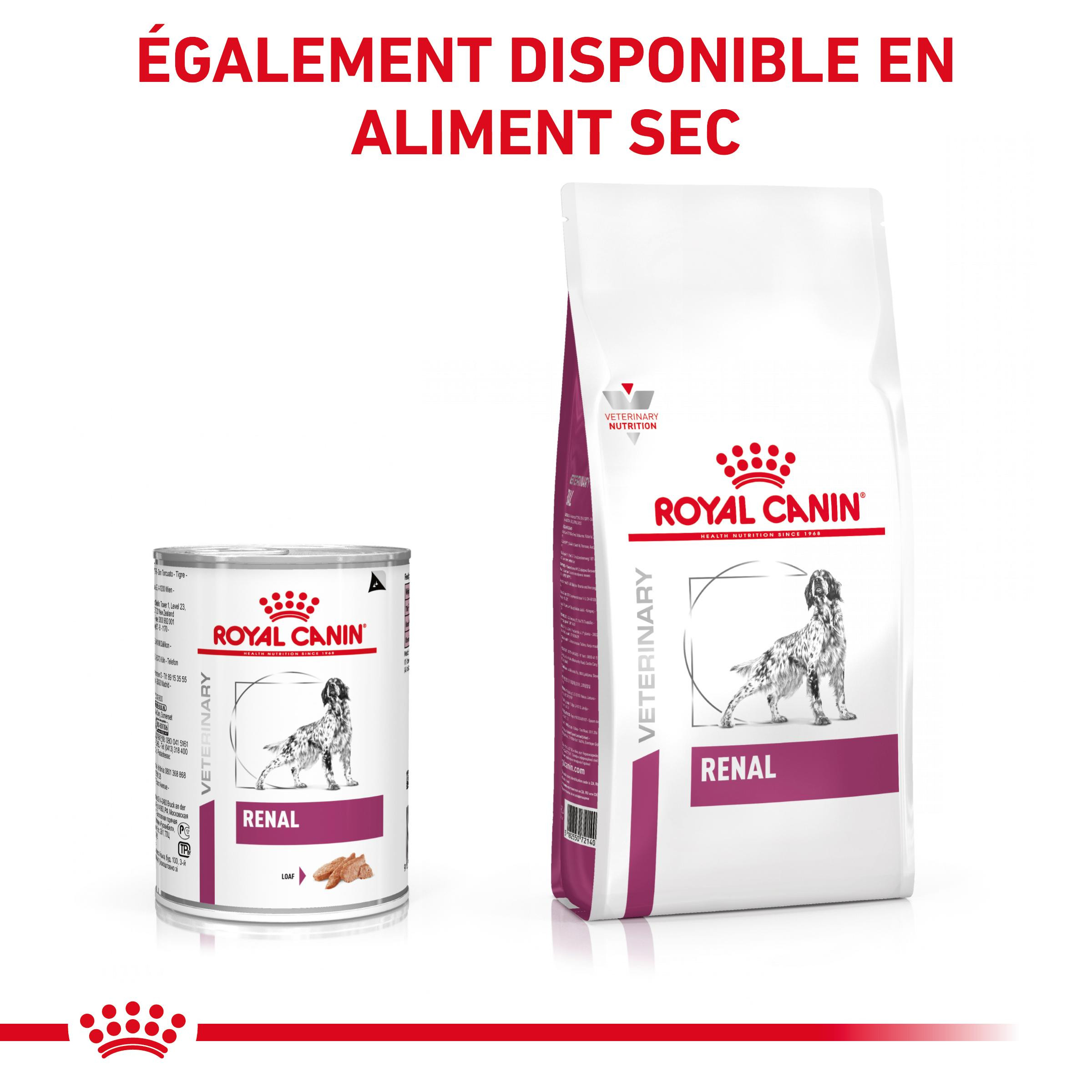Royal Canin Veterinary Renal pâtée pour chien (en boîte) est un aliment vétérinaire complet destiné aux chiens adultes et âgés souffrant d'insuffisance rénale chronique ou aiguë.