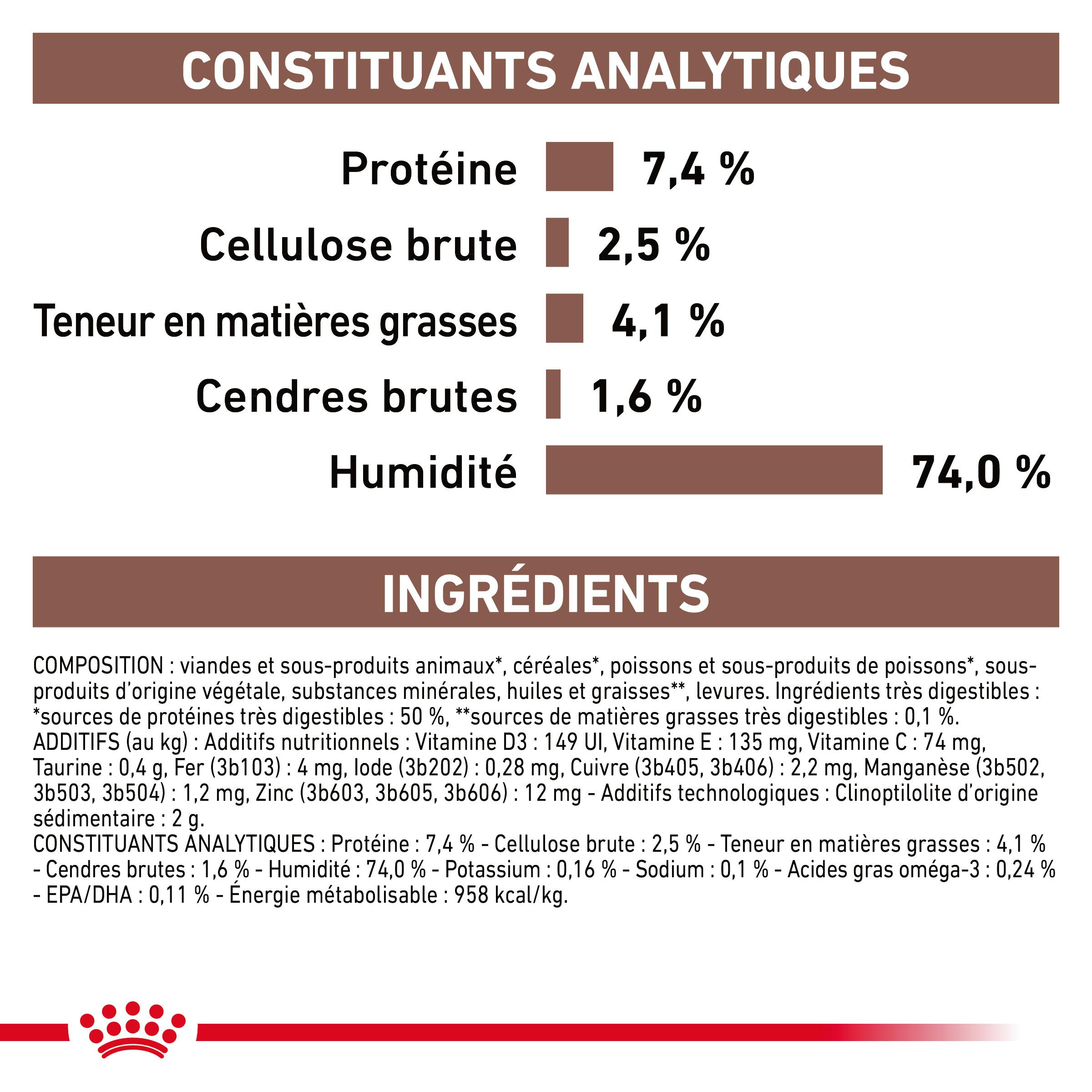 Composants analytiques : Protéines brutes : 7,4% - Fibres brutes : 2,5% - Matières grasses brutes : 4,1% - Cendres brutes : 1,6% - Humidité : 74,0% - Potassium : 0,16% - Sodium : 0,1% - Acides gras oméga-3 : 0,24% - EPA/DHA : 0,11% - Energie métabolisable : 958kcal/kg.