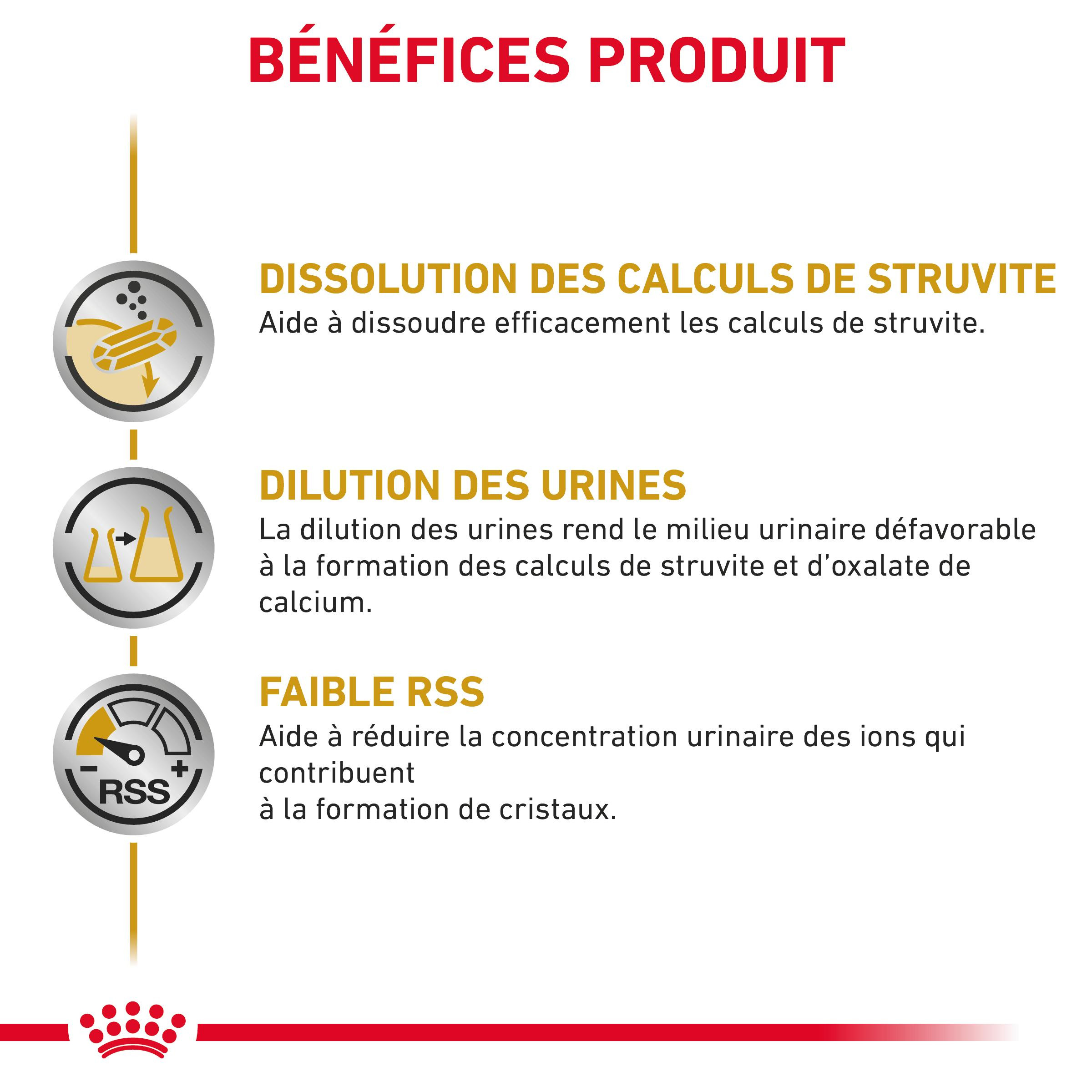 Cette pâtée complète est formulée pour favoriser un environnement urinaire défavorable au développement de cristaux de stuvite. Pour ce faire, elle a une faible valeur RSS (sursaturation relative), ce qui signifie qu'elle contient moins de composants susceptibles de former des cristaux. De plus, cet aliment contient des substances qui incitent le chien à boire davantage, de sorte que la quantité d'urine dans la vessie augmente et que la concentration de l'urine diminue. Il y a donc moins de risques que les composants se transforment en cristaux.